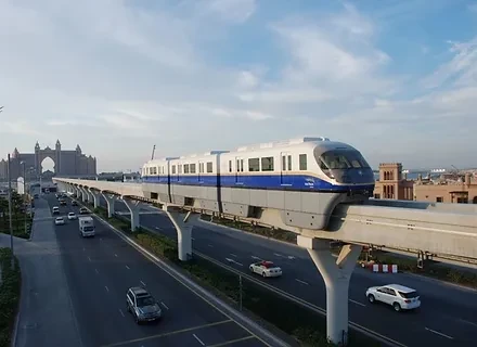 The monorail runs along the trunk of the Palm Jumeirah in Dubai connecting the Gateway station at the entry to the Palm to the Atlantis hotel at the far end. Palm Monorail is a good vantage point to see the Palm Jumeirah. It is often used by tourists to get a good view of the island and it also takes you from the far end of the island to the main part of Dubai where it links in with Al Sufouh Road (and eventually the Dubai Metro line system).