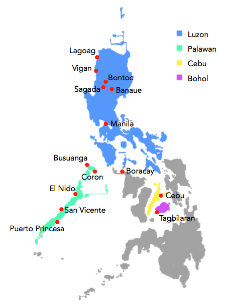 The country is divided into the geographical area of Luzon, Visayas and Mindanao. Its capital, the city of Manila, is in Luzon. You can also enter through the cities of Cebu in the Visayas, and Davao in Mindanao.